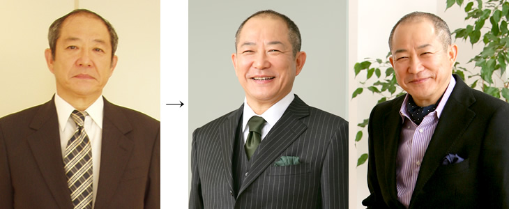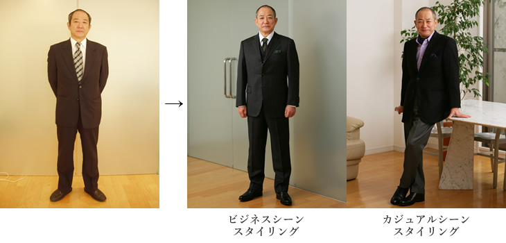 思い切って短いヘアスタイルに変えたことによって、本来の目力、瞳の輝きが引き立ちました。さらに、スリーピースのスーツにより、もともと備えていたダンディで渋い印象が外見に表現され、品のよさや落ち着きも感じられます。また、ビジネスシーンファッションスタイリングでは、フォレストグリーンのネクタイとチーフを取り入れ、カジュアルシーンファッションスタイリングでは、明るいパープルのストライプシャツとアスコットタイを取り入れることによって、華やかさとゴージャス感を演出しています。